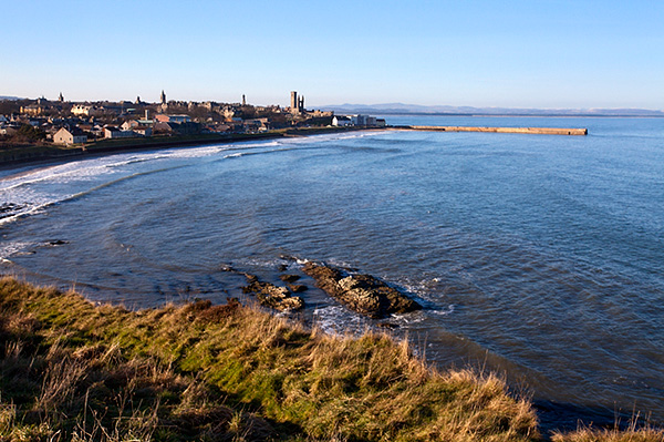 From here it’s the home straight past Kinkell Ness back to St Andrews. After the cliff top caravan park the path descends to the East Sands and offers a fine view across to the harbour.