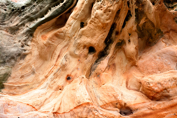 Further up the coast the path follows a burn inland to Boarhills where you can cross and follow a track back to the coast. By the time I reached Buddo Rock it was almost noon so the rock wasn’t ideally lit, but this curious sandstone formation plonked at the top of the beach certainly had interest and would be worth a future trip. It’s also got a nicely eroded part which makes a natural bench on which to sit and enjoy lunch. After the sandwiches had gone, the sun had gone in too, so the soft diffused light was actually quite nice for photographing some abstract rock details.