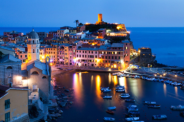 As the sun descended further and Venazza went into the shade I went back up to the start of the trail and waited for the floodlights to come on. In the blue twilight about twenty minutes after sunset the light was perfect – a fitting end to a day exploring the Cinque Terre.