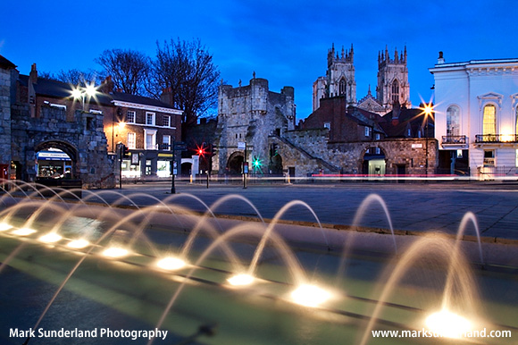 As the sun started to set it was time to head along to Exhibition Square and get ready for dusk at the fountain in front of the newly refurbished art gallery. The last rays of the sun caught Bootham Bar and the minster very nicely.