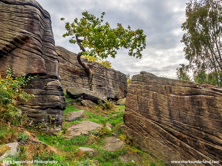 The glen is quiet craggy too, with lots of nice gritstone boulders dotted around, some covered in bright orange and green lichen. Following the path back up the side of the glen, I emerged onto the rocky rim to find a great little oak tree cliging to the rocks (see feature image, top). This was difficult to photograph against the bright sky, but it was worth setting things up and exposing carefully to get a decent shot of it – it’s definitely one to come back to.